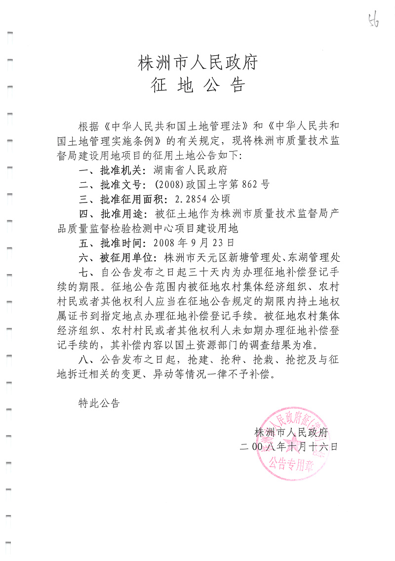 征地公告(质量技术监督局产品质量监督检验检测中心2.2854公顷)