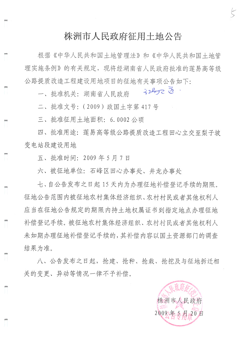 征地公告(莲易高等级公路提质改造工程田心立交至梨子坡变电站段)