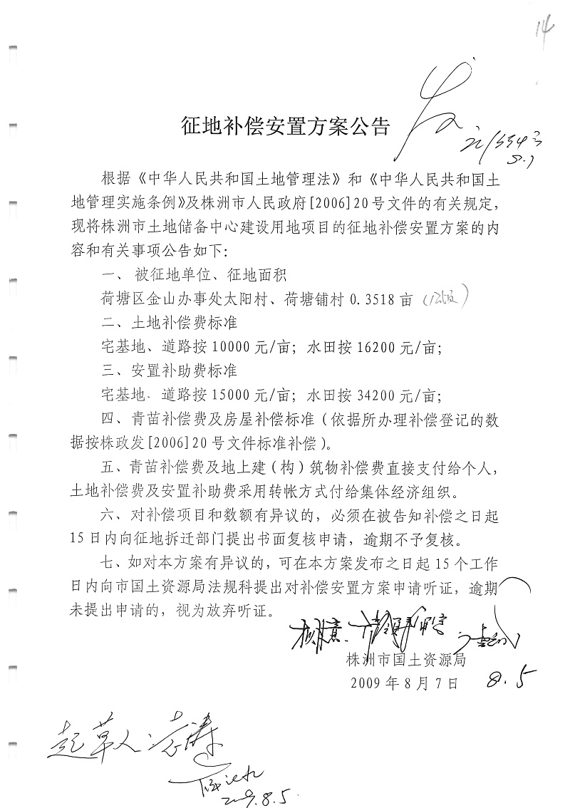 安置公告(荷塘区金山办事处太阳村、荷塘铺村储备地0.3518公顷)