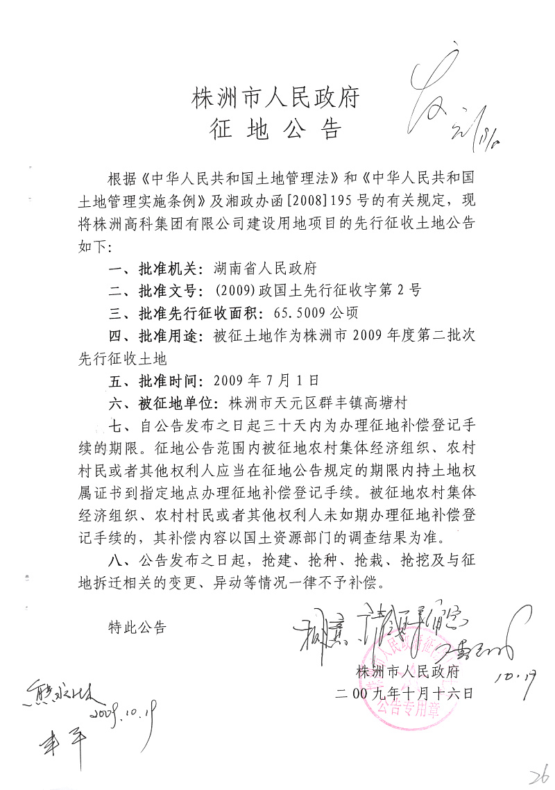 征地公告(高科株洲市2009年度第二批次先行征收土地65.5009公顷)