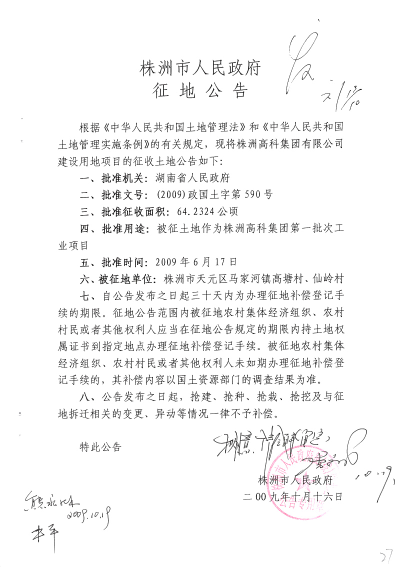 征地公告(株洲高科集团第一批次工业项目64.2324公顷)