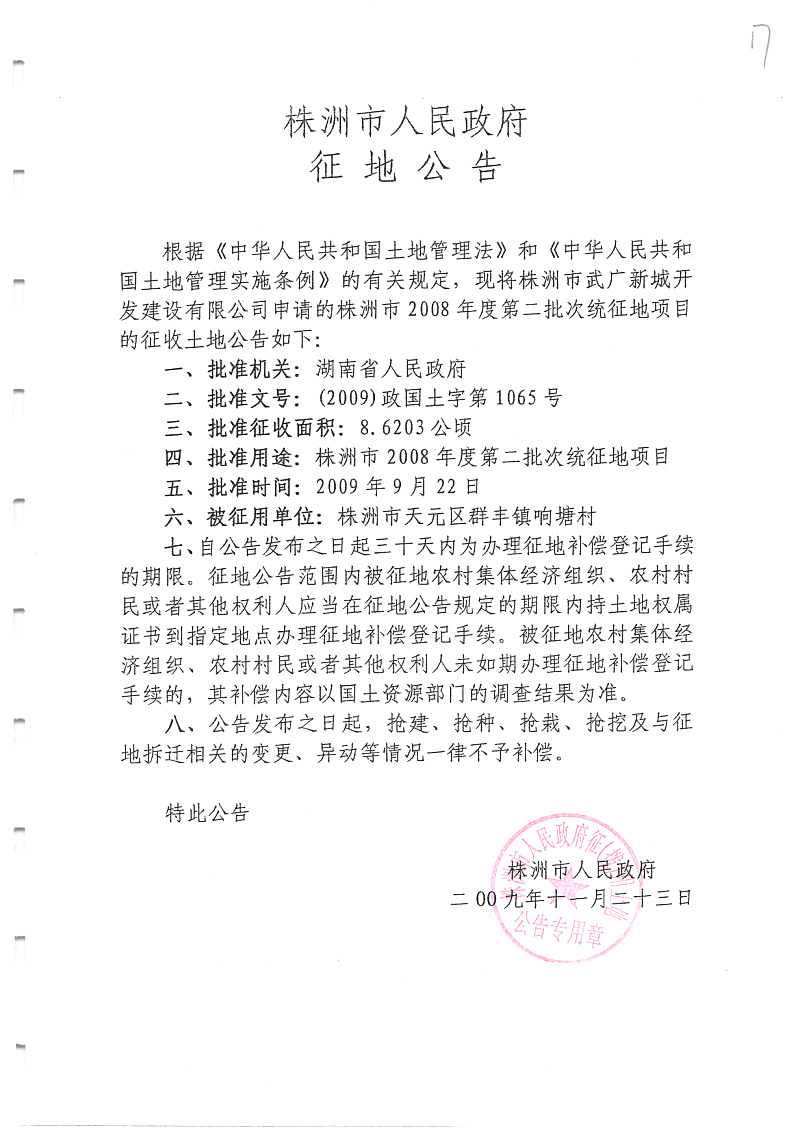 征地公告(武广新城开发公司株洲市2008年度第二批次统征地)