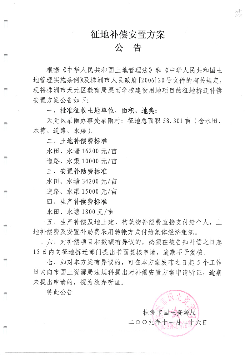 安置公告(天元区教育局栗雨学校)