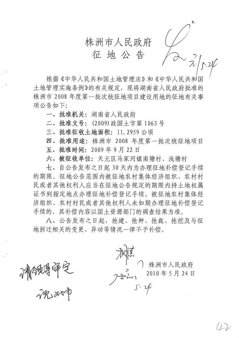征地公告(2008年度第一批次统征地11.2959公顷天元区南塘村、浅塘村)