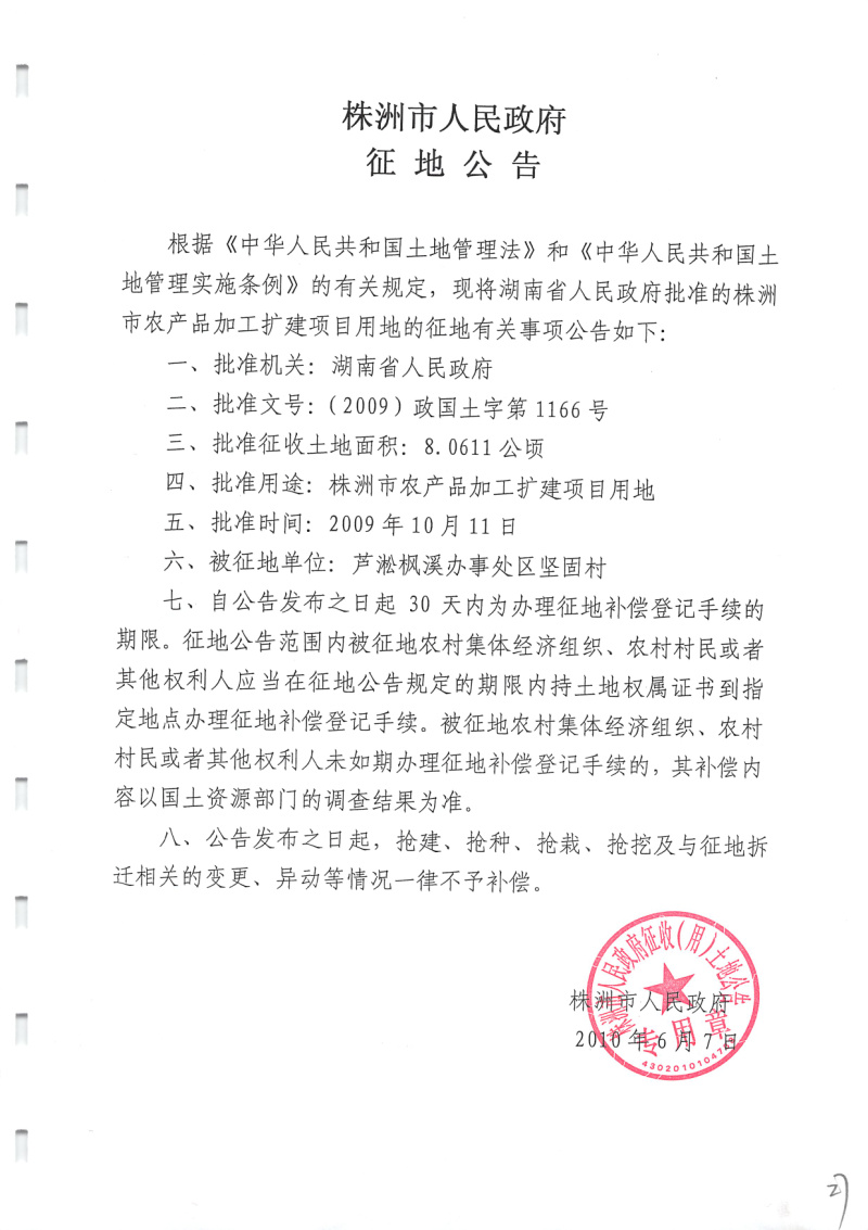 征地公告(株洲市农产品加工扩建项目)