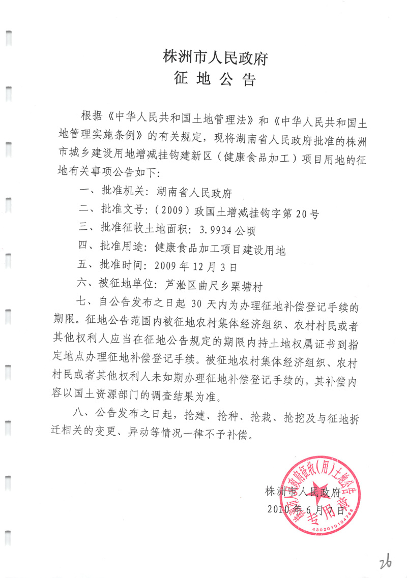 征地公告[株洲市城乡建设用地增减挂钩建新区(健康食品加工)用地]
