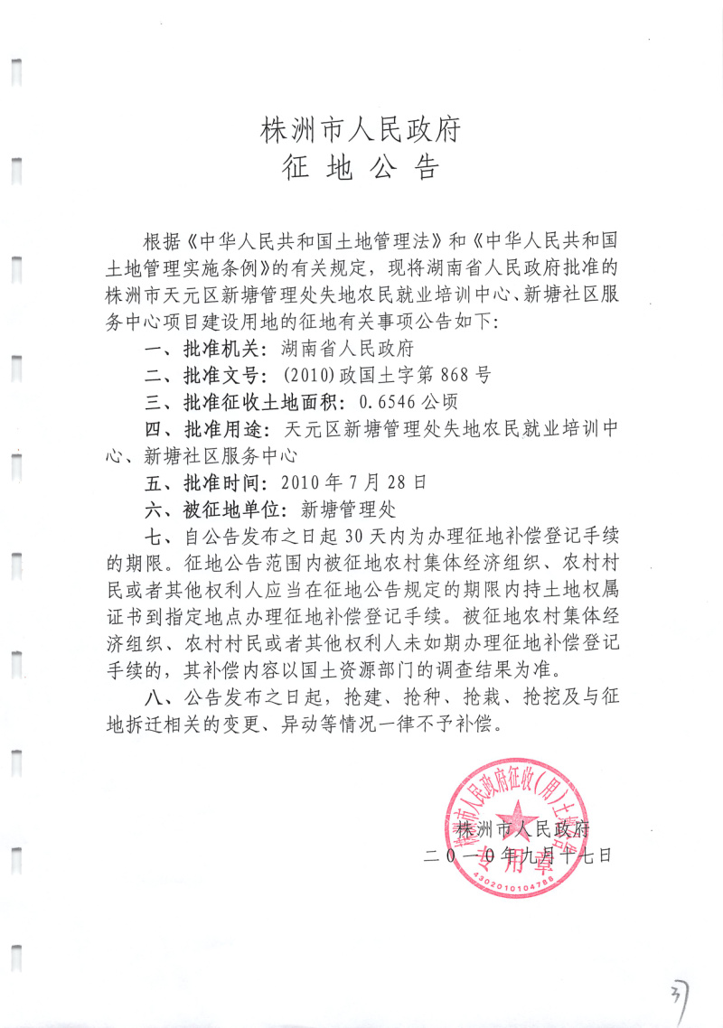 征地公告(天元区新塘管理处失地农民就业培训中心、新塘社区服务中心)