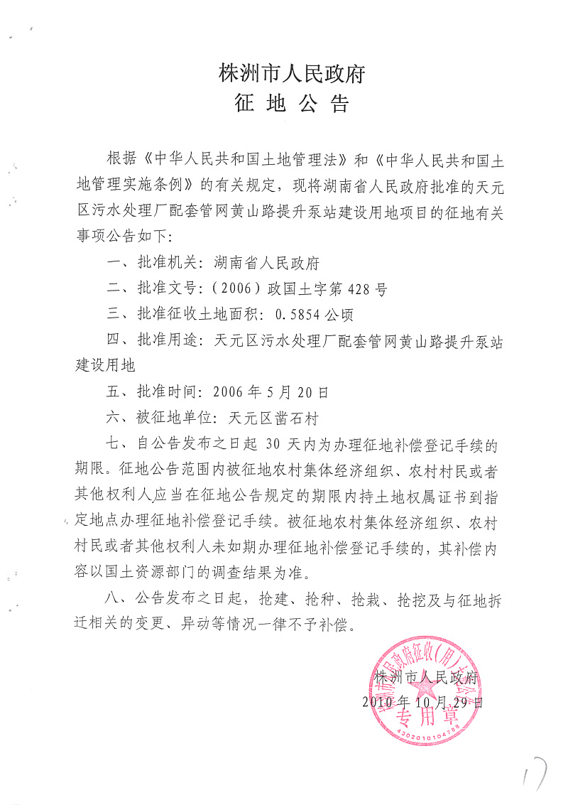 征地公告(天元区污水处理厂配套管网黄山路提升泵站)