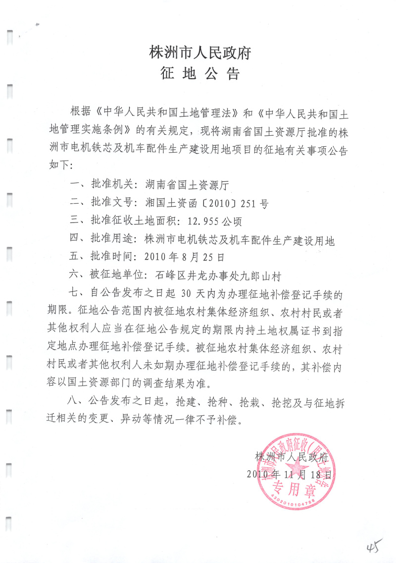 征地公告(株洲市电机铁芯及机车配件生产用地)
