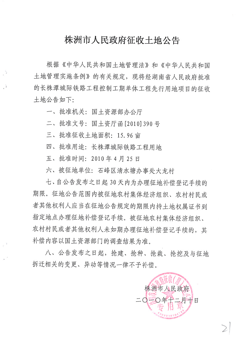 征地公告(长株潭城际铁路15.96亩石峰区大龙村)