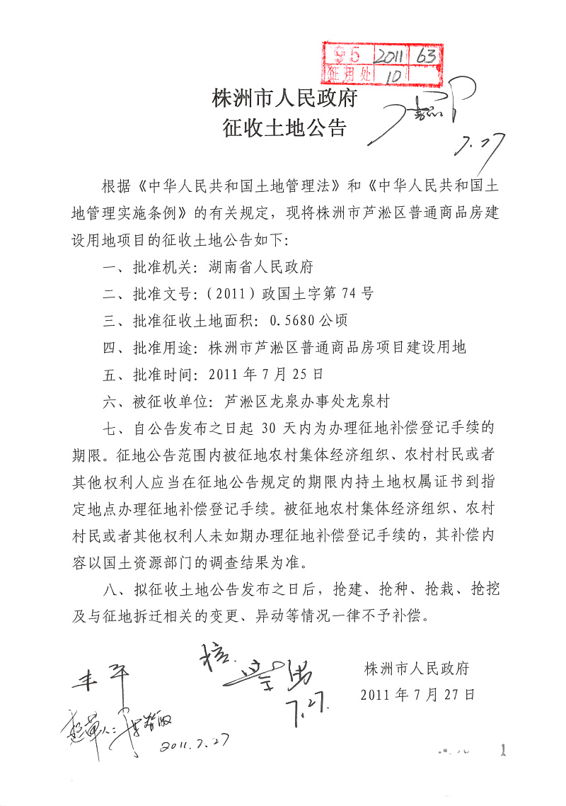 征地公告(芦淞区普通商品房龙泉村0.5680公顷)