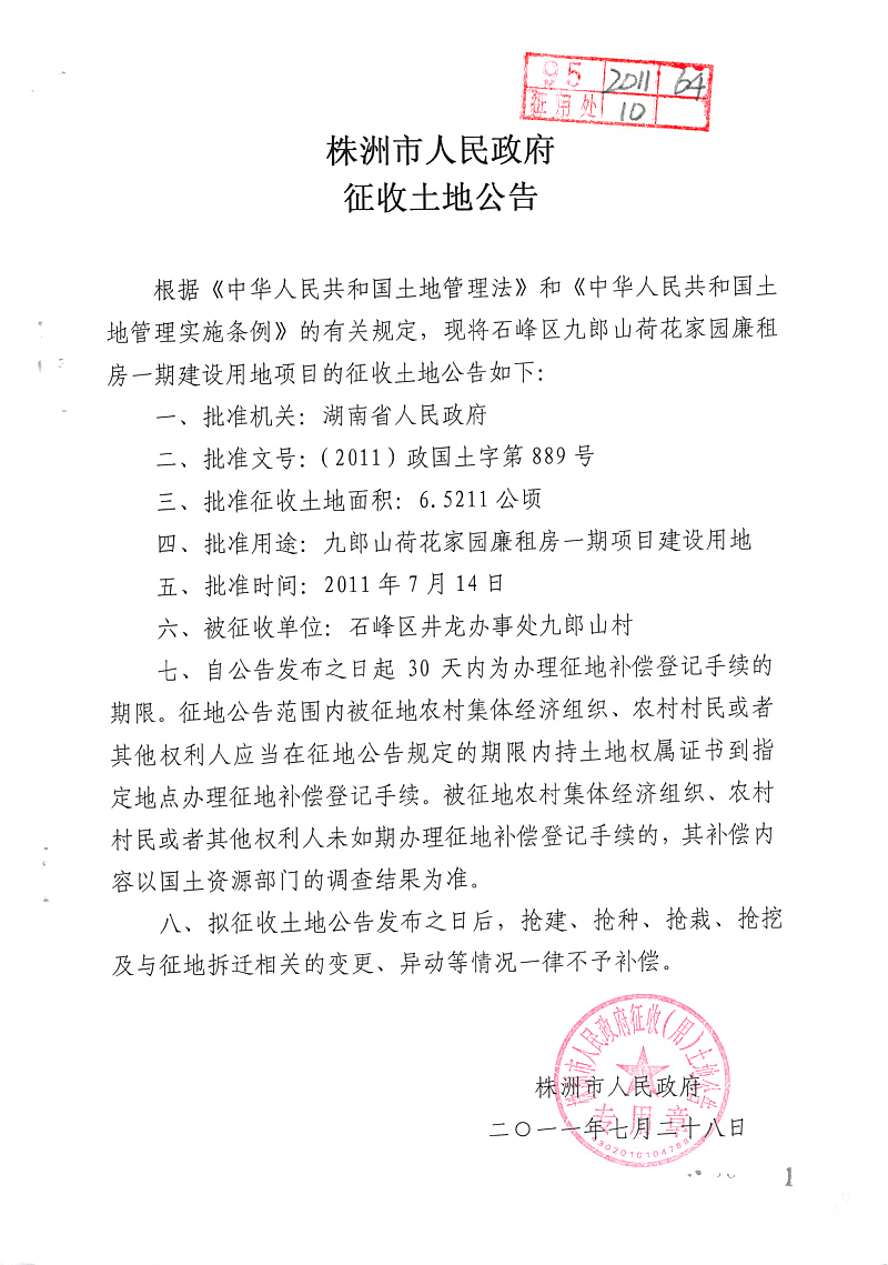 征地公告(九郎山荷花家园廉租房一期6.5211公顷)