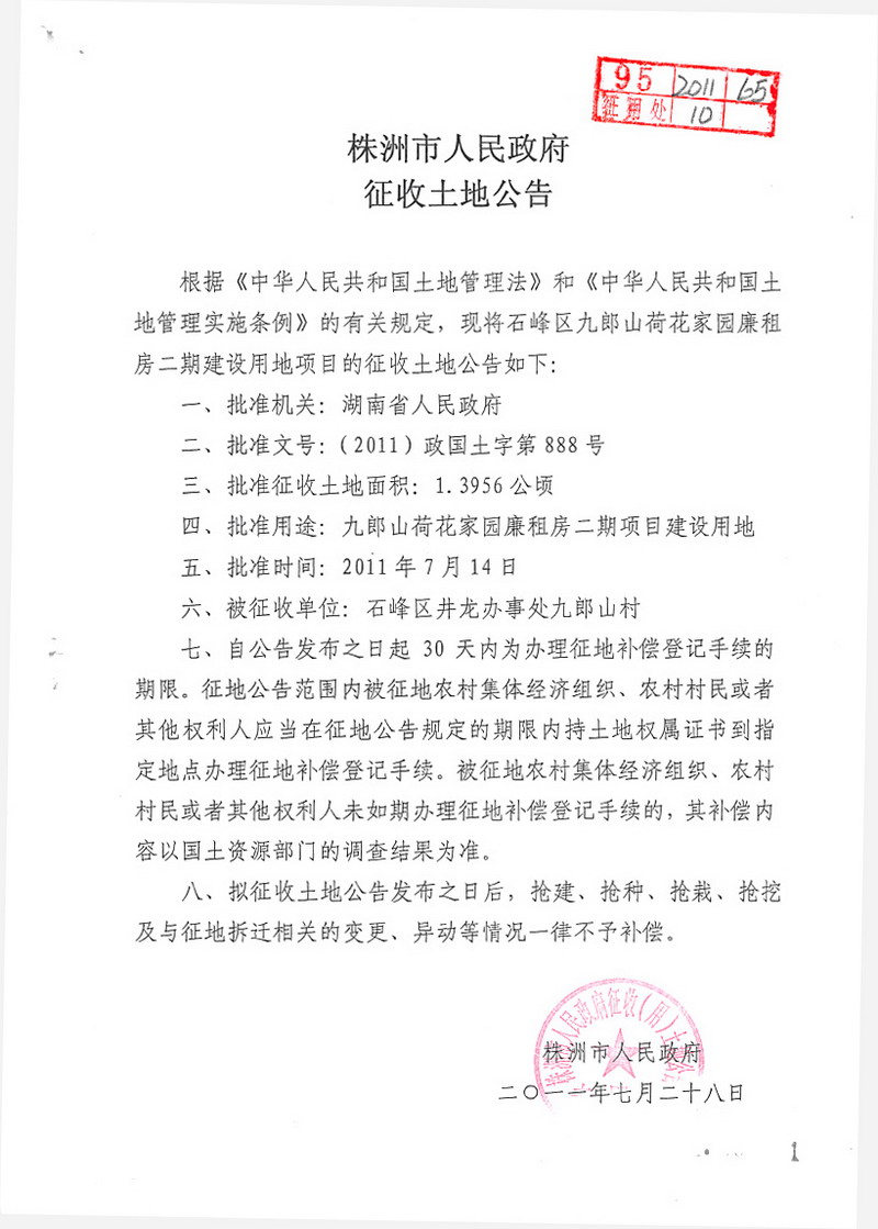 征地公告(九郎山荷花家园廉租房二期1.3956公顷)