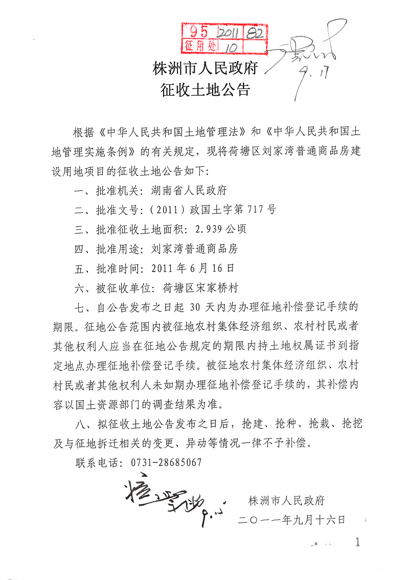 征地公告(荷塘区刘家湾普通商品房2.939公顷)