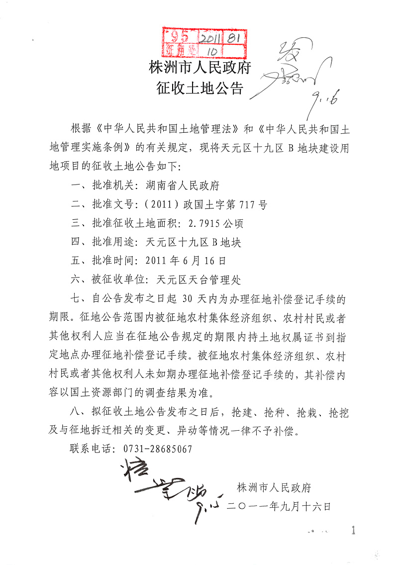 征地公告(天元区十九区B地块2.7915公顷)
