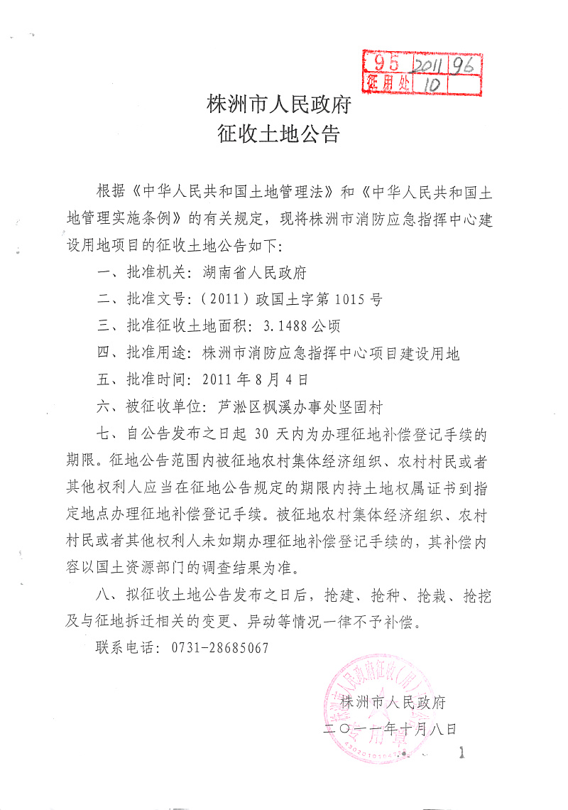 征地公告(株洲市消防应急指挥中心3.1488公顷)
