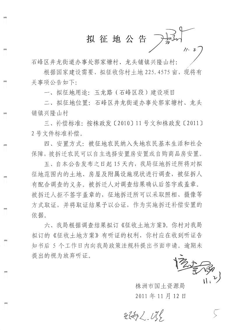 拟征地公告(玉龙路石峰区段225.4575亩)