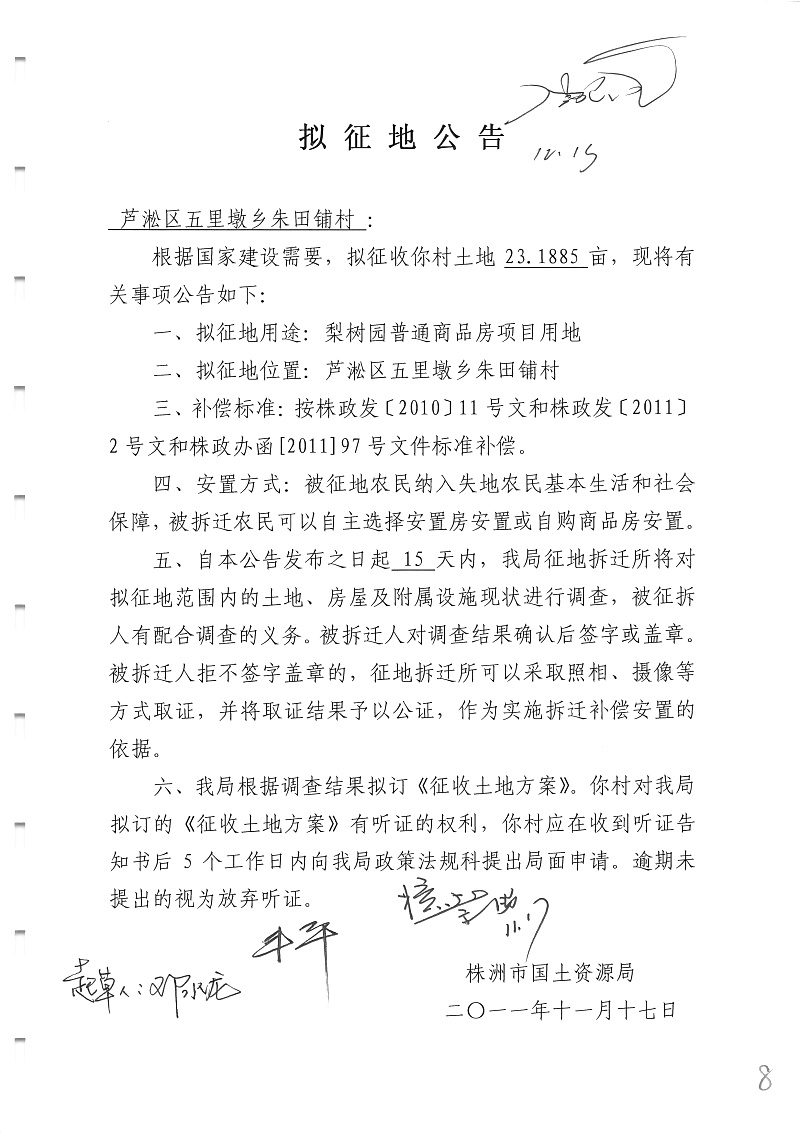 拟征地公告(梨树园普通商品房项目芦淞区五里墩乡朱田铺村23.1885亩)