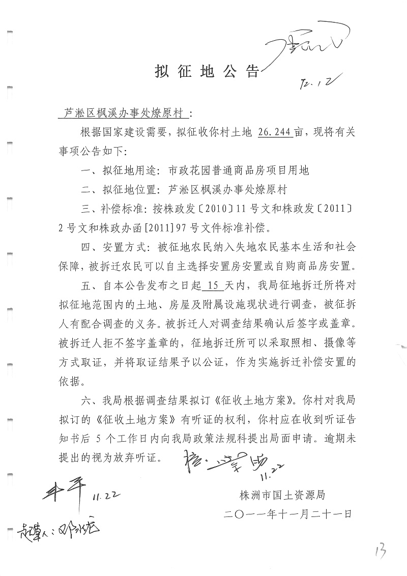 拟征地公告(市政花园普通商品房26.244亩)