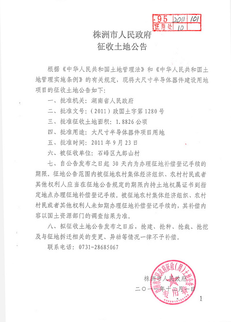 征地公告(石峰区大尺寸半导体器件1.8826公顷)