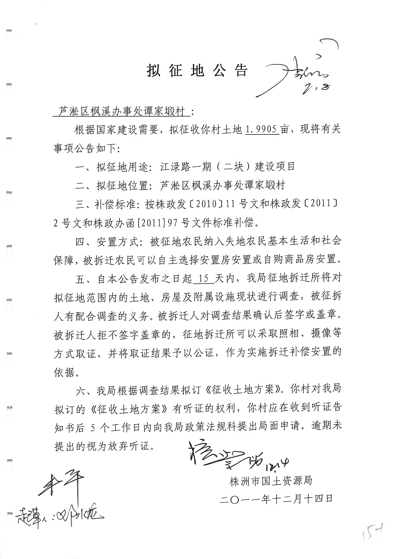 拟征地公告(江渌路一期二块芦淞区枫溪办事处谭家塅1.9905亩)