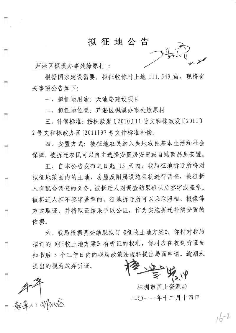 拟征地公告(天池路芦淞区枫溪办事处燎原村111.549亩)