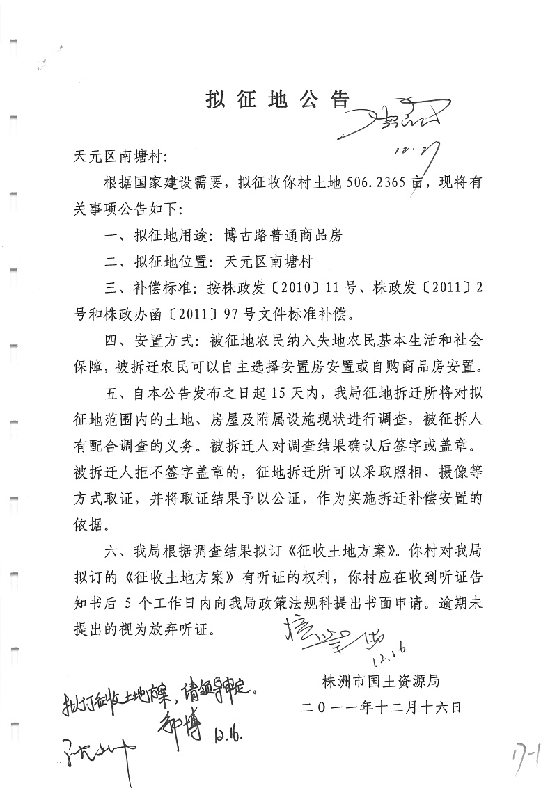 拟征地公告(博古路普通商品房天元区南塘村506.2365亩)