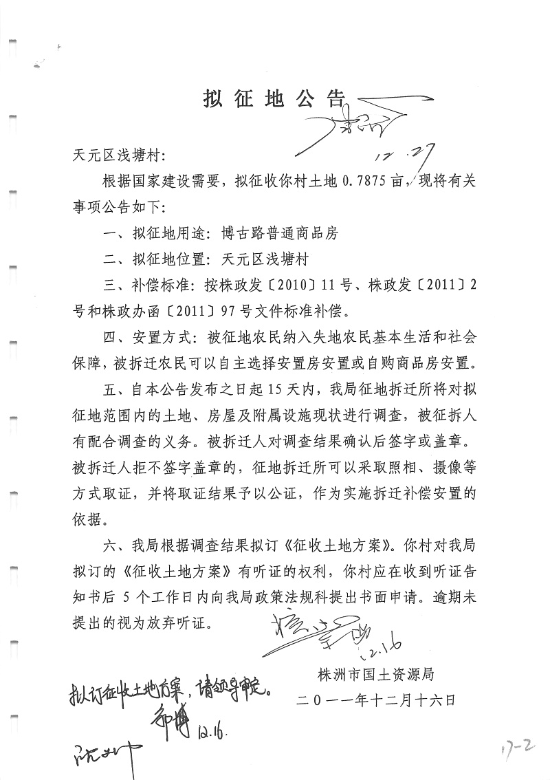 拟征地公告(博古路普通商品房天元区浅塘村0.7875亩)