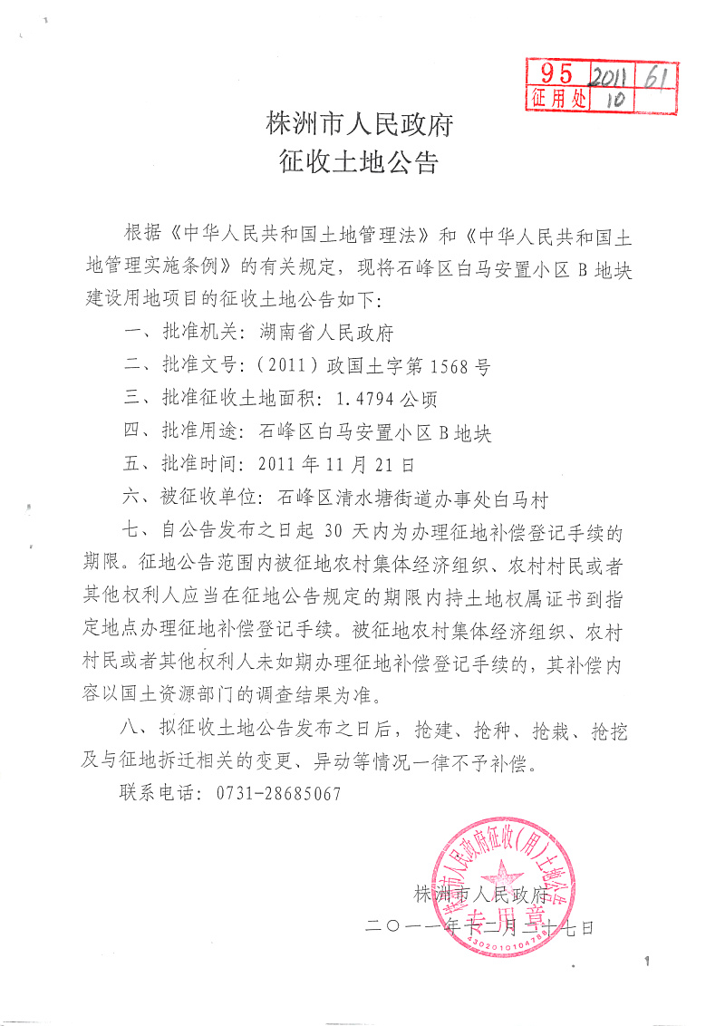 征地公告(石峰区白马安置小区B地块1.4794公顷)