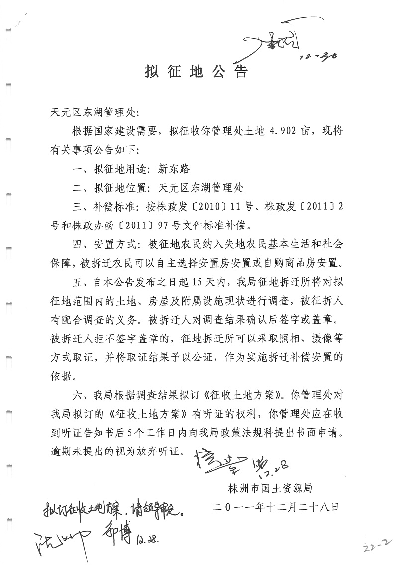 拟征地公告(新东路天元区东湖管理处4.902亩)