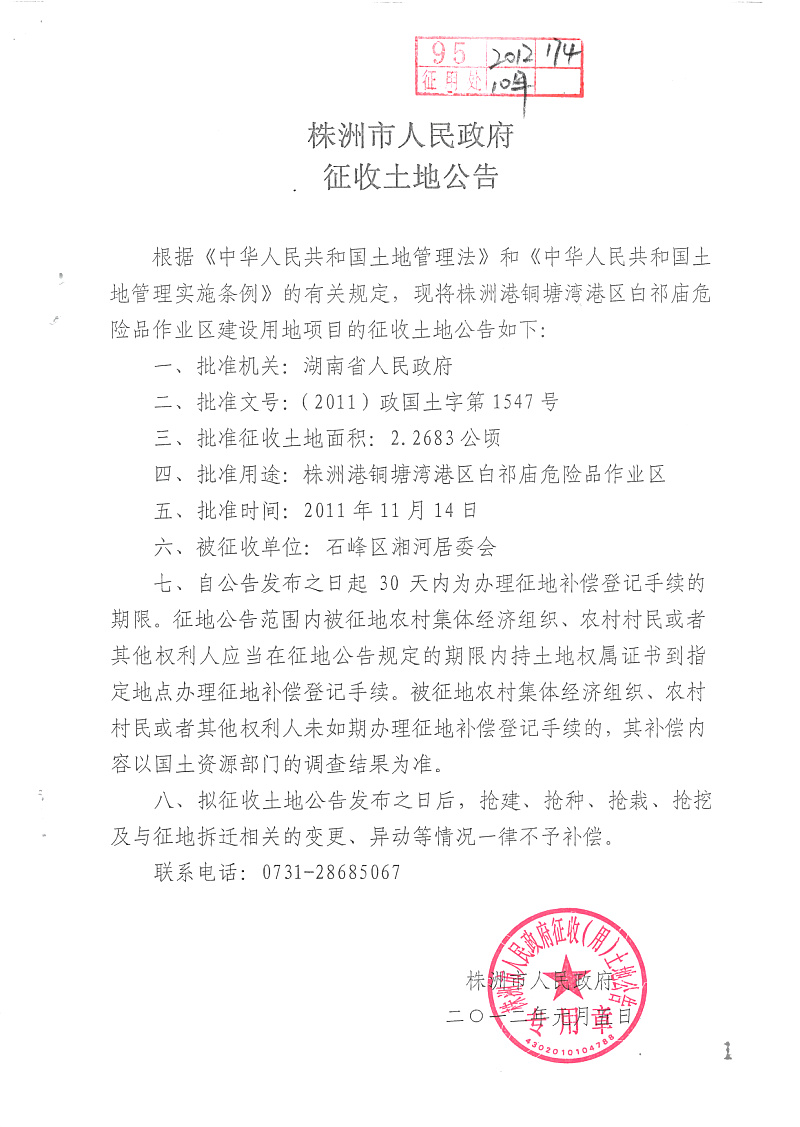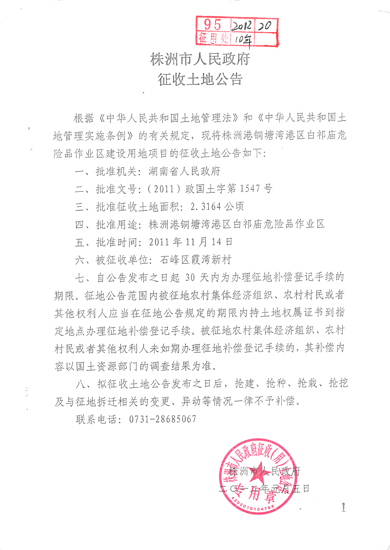 征地公告(株洲港铜塘湾港区白祁庙危险品作业区)