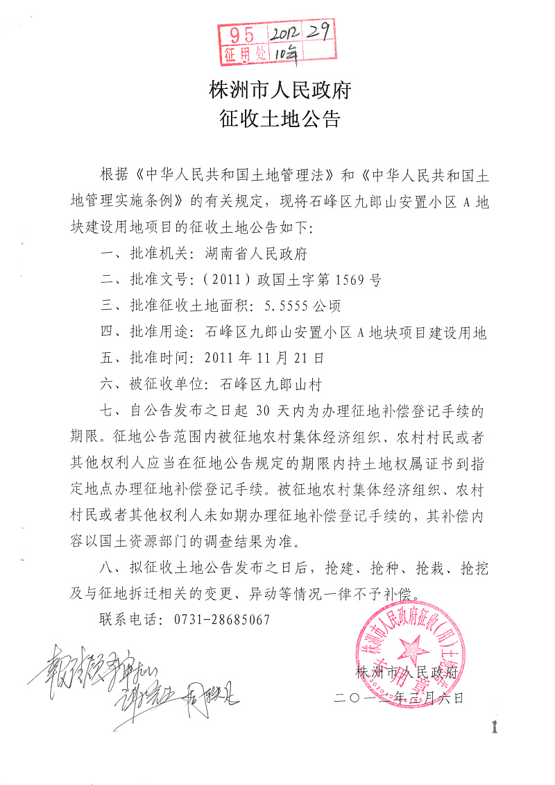 征地公告(石峰区九郎山安置小区A地块5.5555公顷)