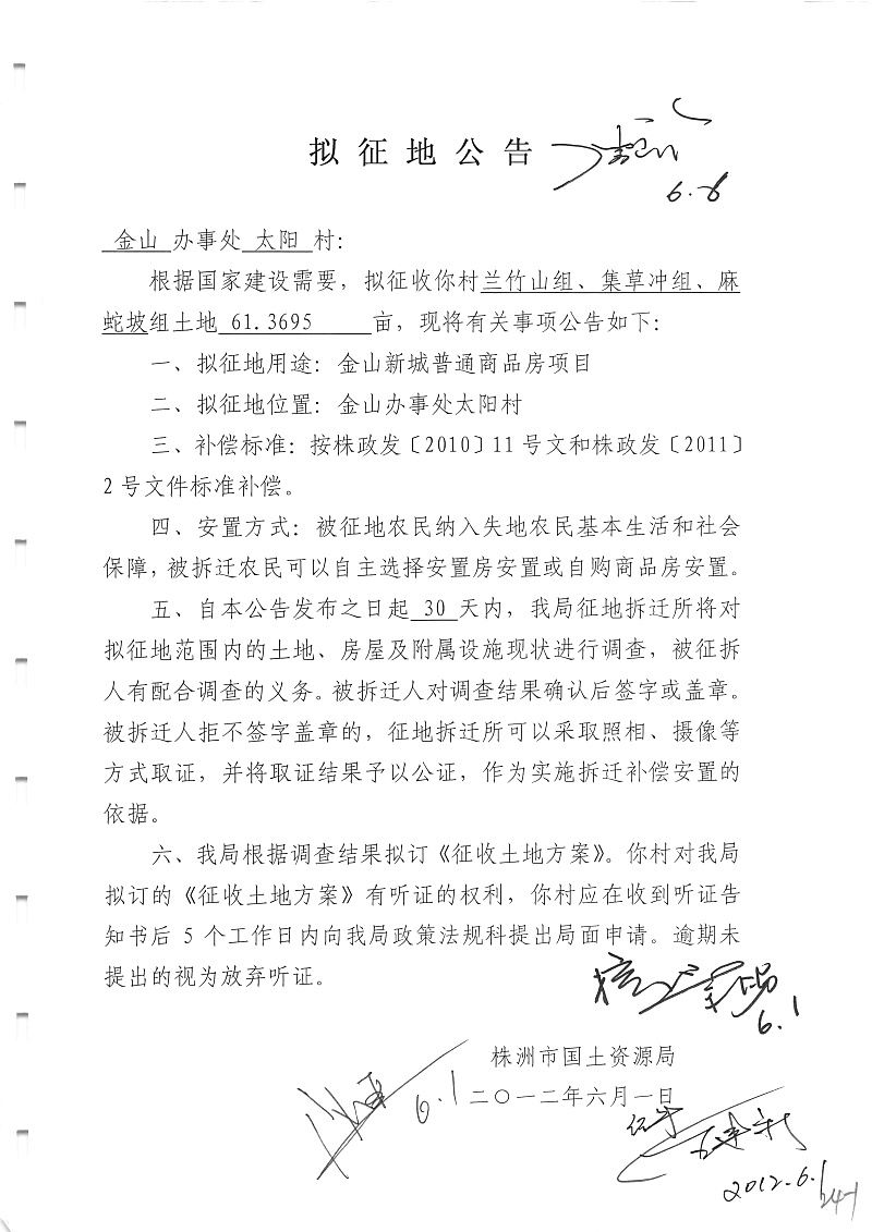 拟征地公告(金山新城普通商品房金山办事处太阳村61.3695亩)