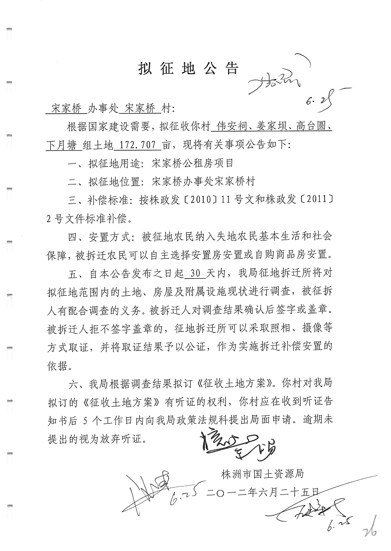 拟征地公告(宋家桥公租房172.707亩)