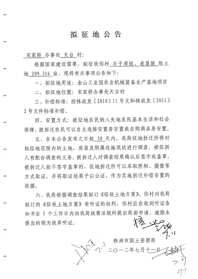 拟征地公告(金山工业园农业机械装备生产基地宋家桥办事处天台村209.316亩)