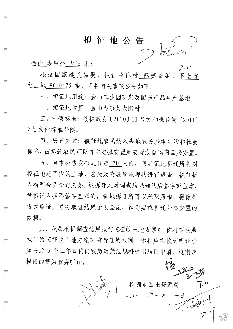 拟征地公告(金山工业园研发及配套产品生产基地80.0475亩)