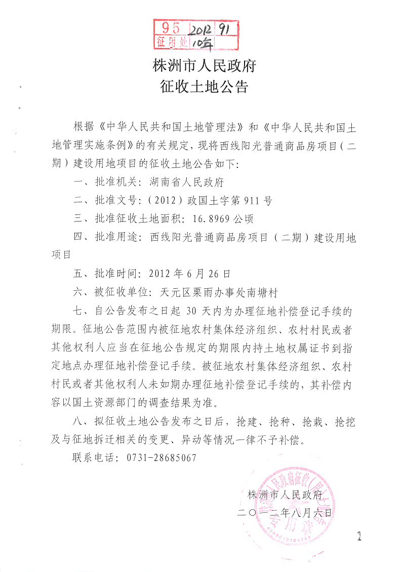 征地公告(西线阳光普通商品房二期16.8969公顷)