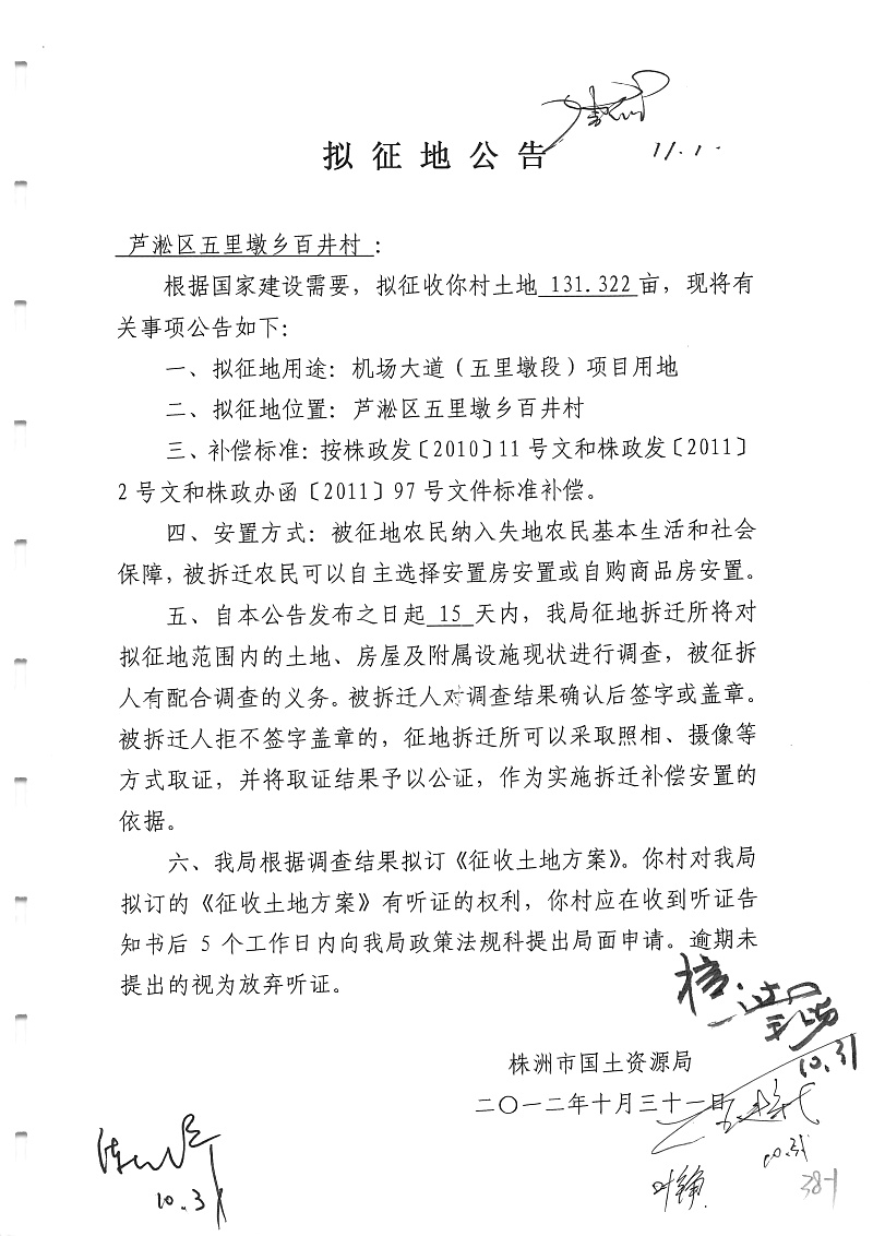 拟征地公告(机场大道五里墩段百井村131.322亩)