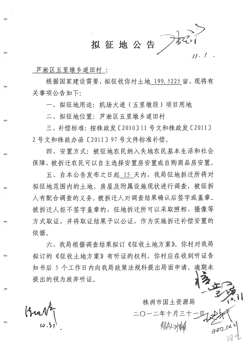 拟征地公告(机场大道五里墩段道田村199.5225亩)