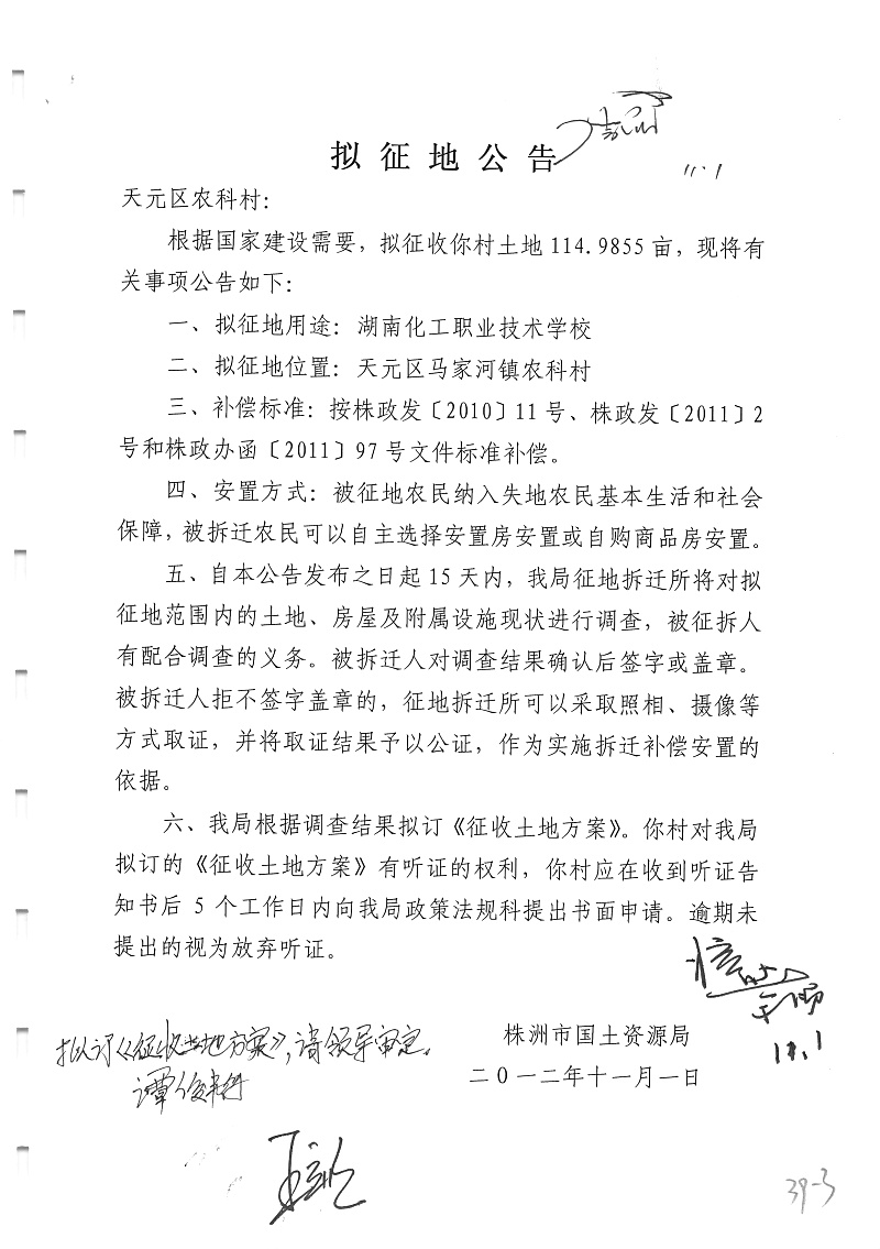 拟征地公告(湖南化工职业技术学校天元区农科村114.9855亩)