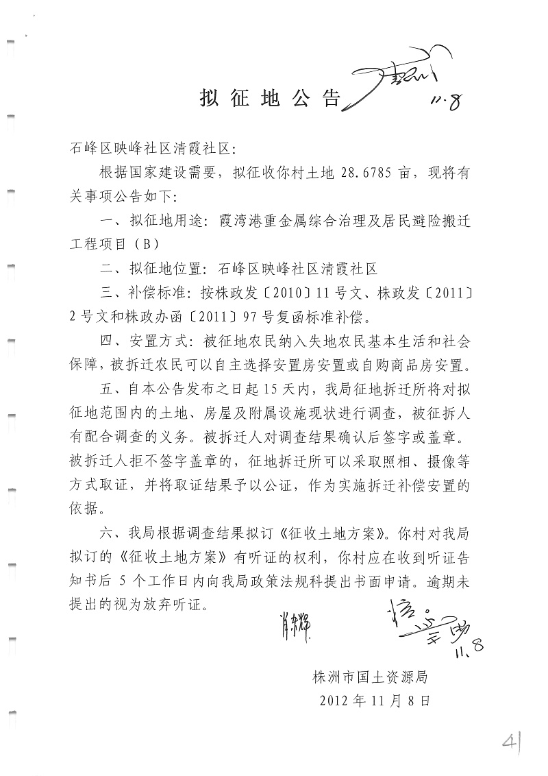 拟征地公告(霞湾港重金属综合治理及居民避险搬迁工程项目映峰社区清霞社区28.6785亩)