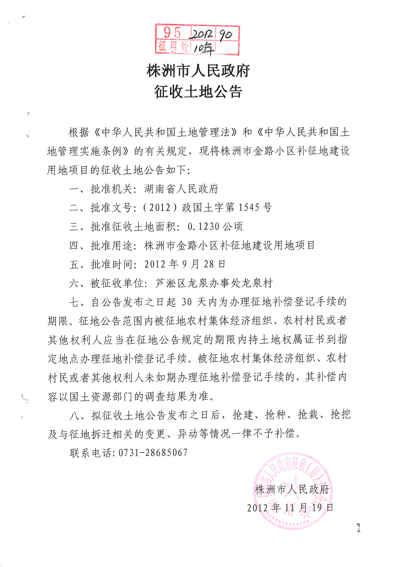 征地公告(金路小区补征地0.123公顷)