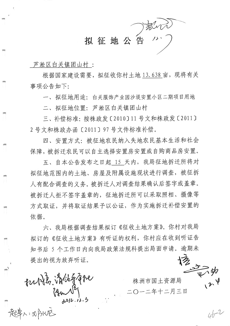 拟征地公告(白关服饰产业园沙堤安置小区二期白关镇团山村13.638亩)