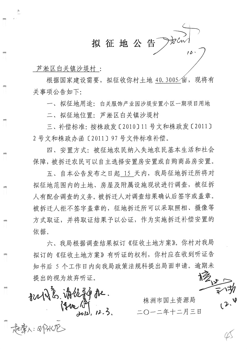 拟征地公告(白关服饰产业园沙堤安置小区一期40.3005亩)