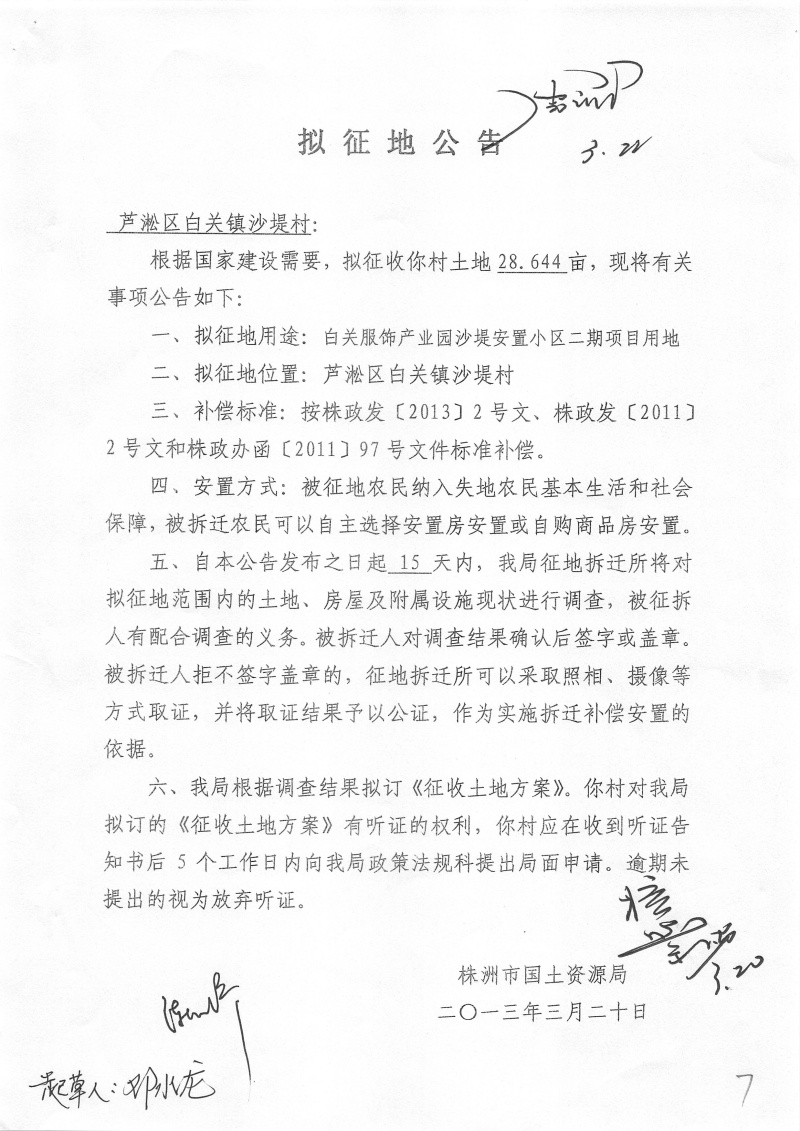 拟征地公告(白关服饰产业园沙堤安置小区二期28.644亩)