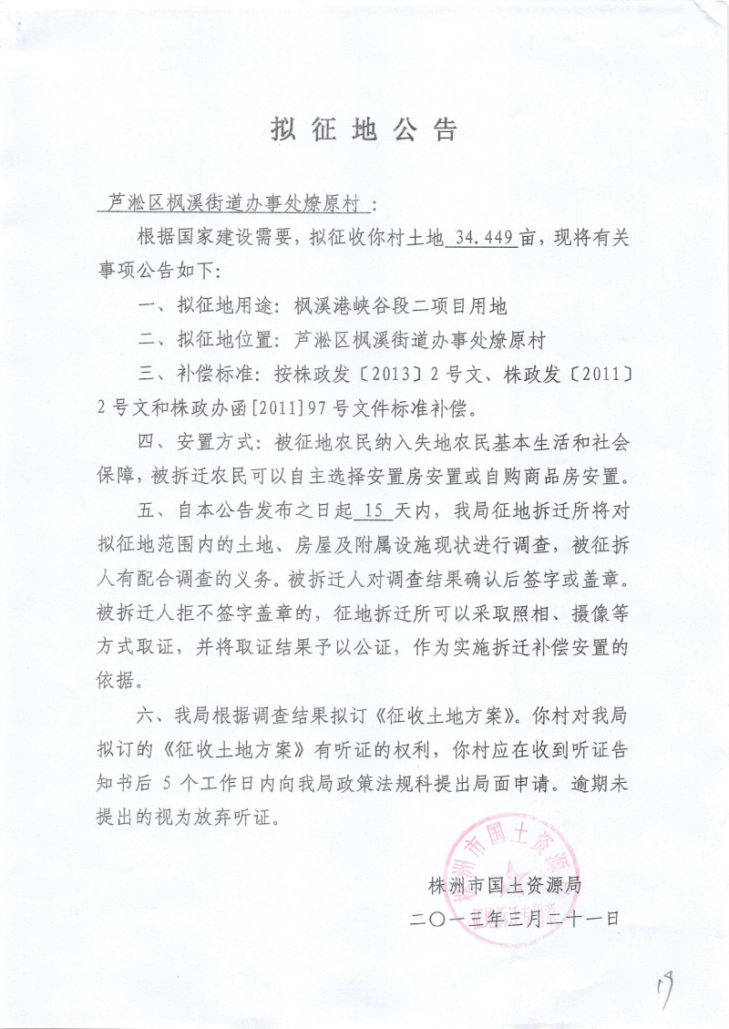 拟征地公告(枫溪港峡谷段二34.449亩)