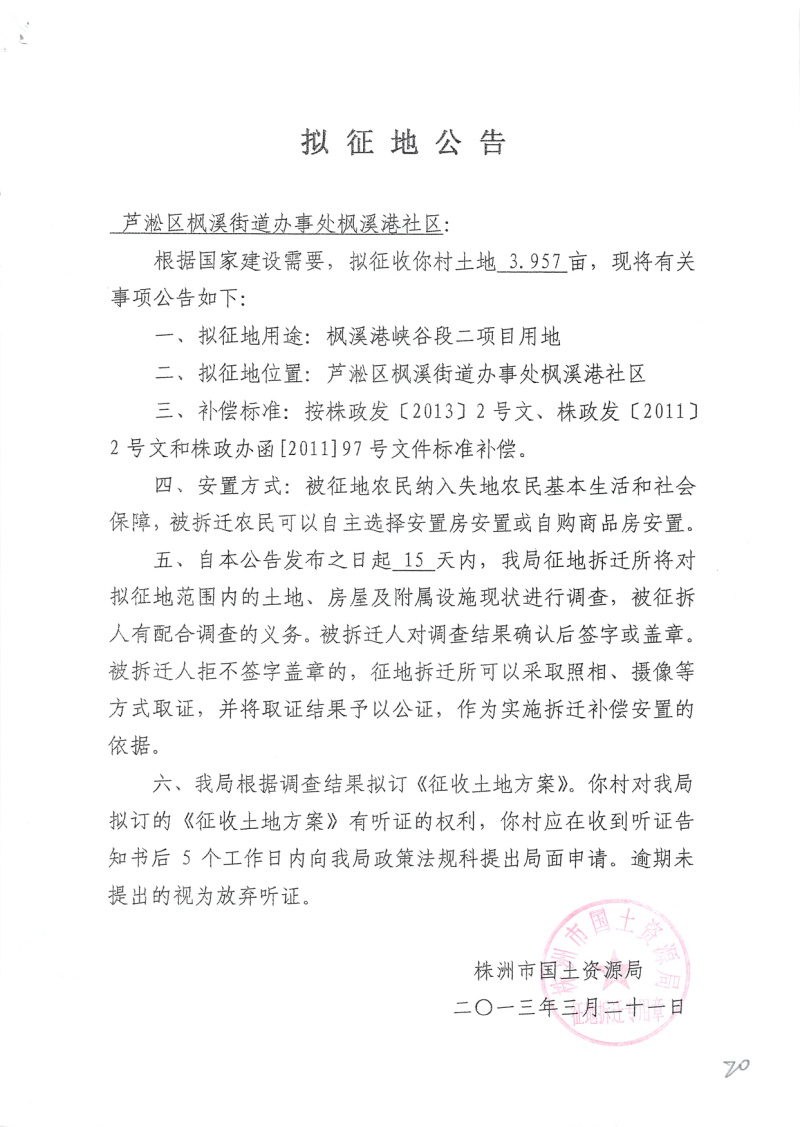 拟征地公告(枫溪港峡谷段二3.957亩)