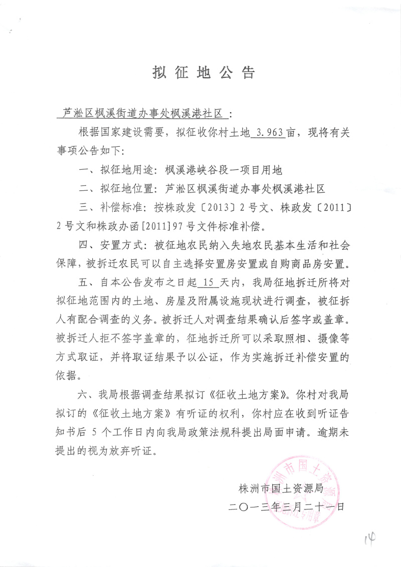 拟征地公告(枫溪港峡谷段一3.963亩)