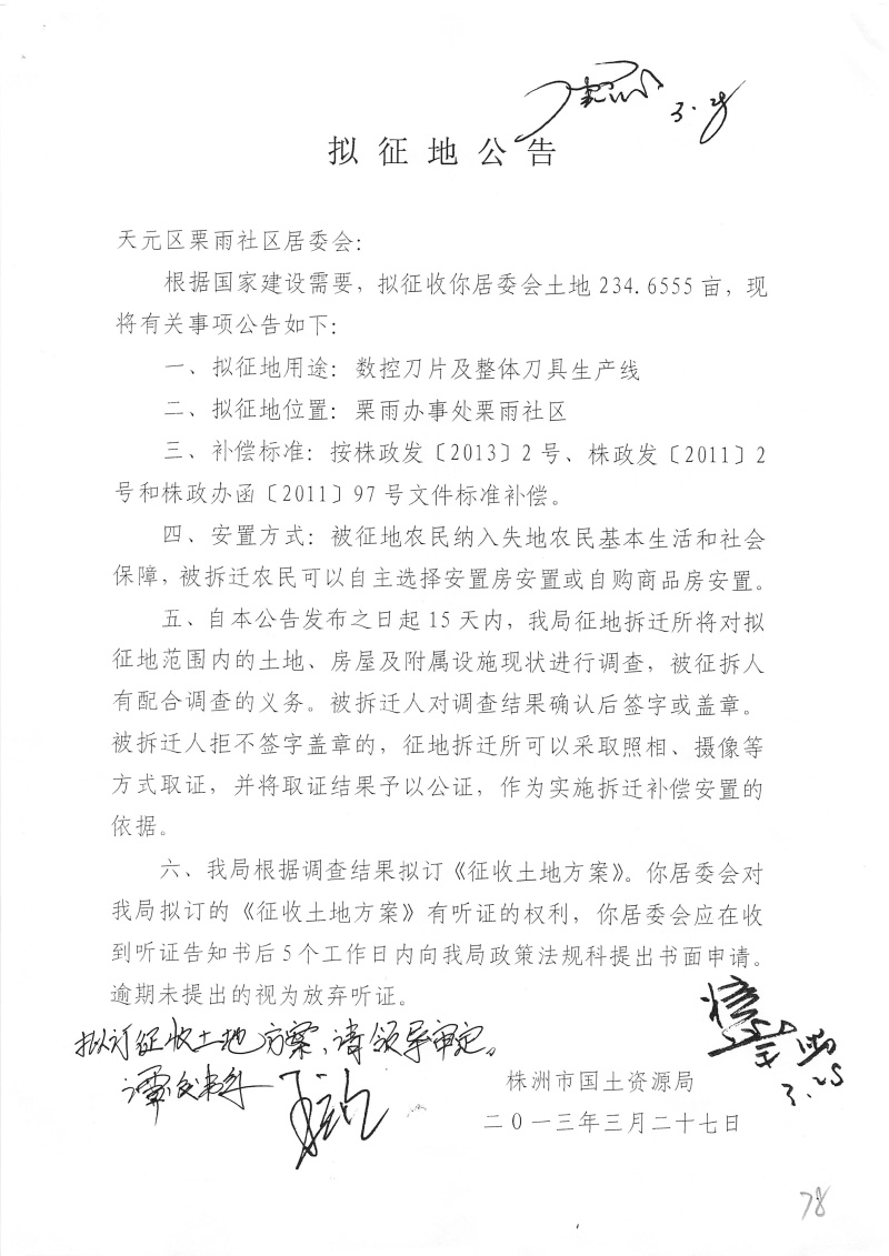拟征地公告(数控刀片及整体刀具生产线234.6555亩)