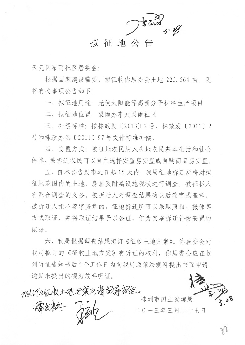 拟征地公告(光伏太阳能等高新分子材料生产225.564亩)